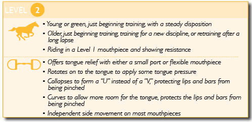 Notes: The MB 04 provides an excellent transition from Level One to Level Two. It is suitable for a wide range of horses including green horses, experienced horses entering the Myler System, horses that have been ridden exclusively in a single-jointed mouthpiece, or horses that have not been ridden for a while needing re-schooling.